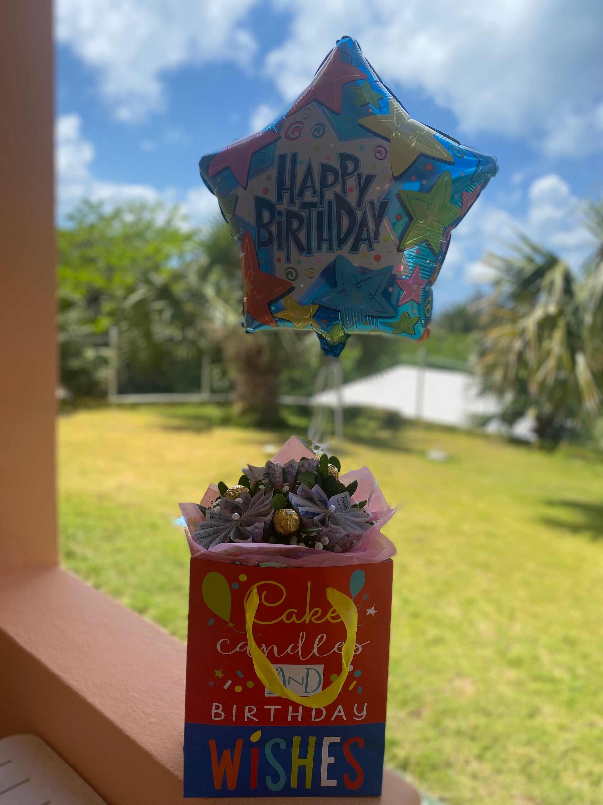 This cute design includes three dollar daises and three premium chocolates with complimentary live greenery, gift wrapped in a bag. You can also have it in a vase or box for additional cost.