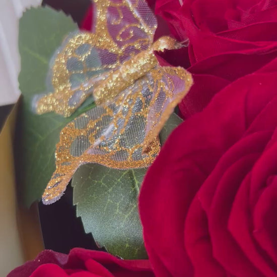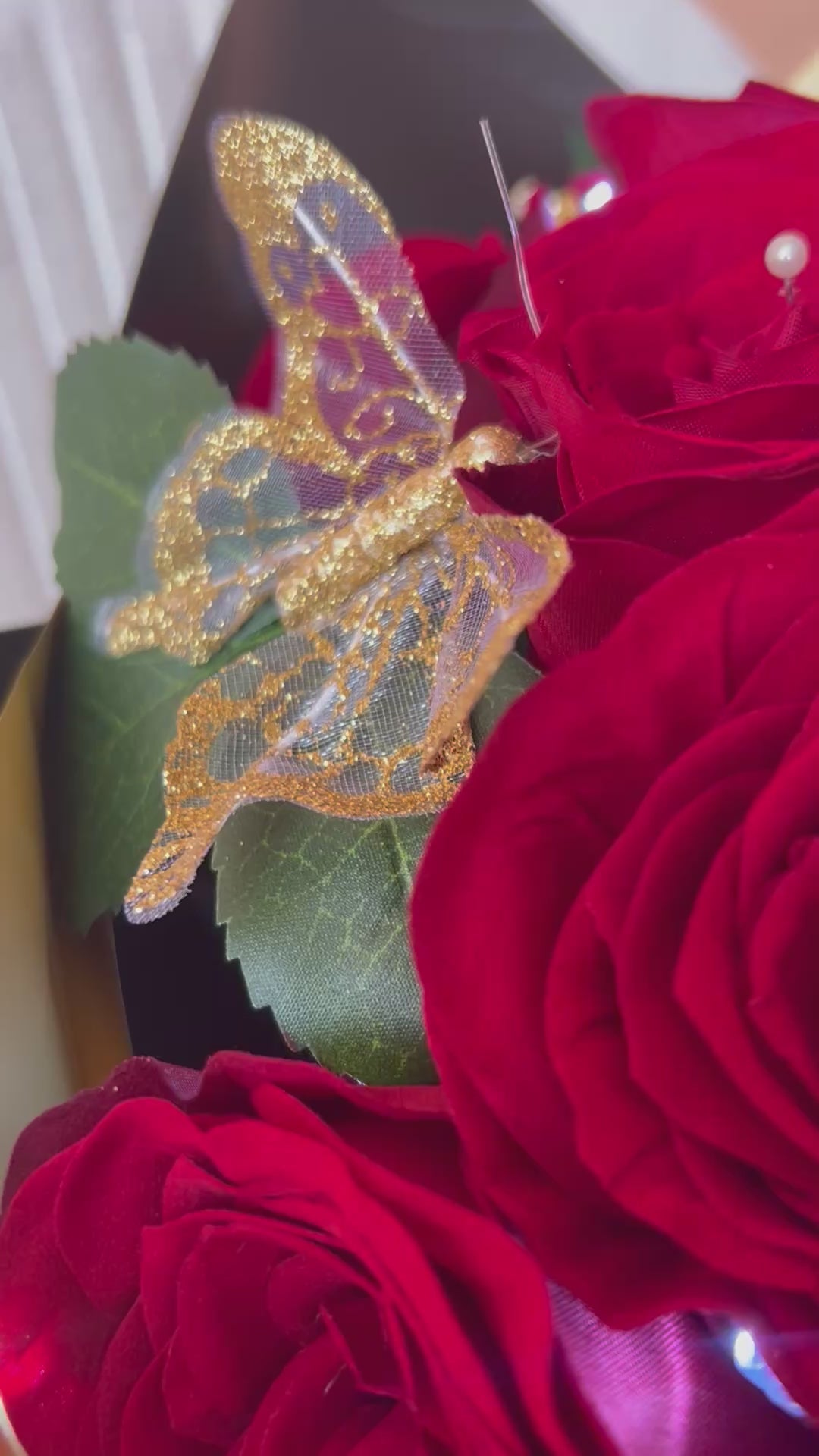 Pictured is a bouquet of faux flowers at a flower budget of $145 with pearl centers, custom ribbon, LED lights, and charms in a gift bag.