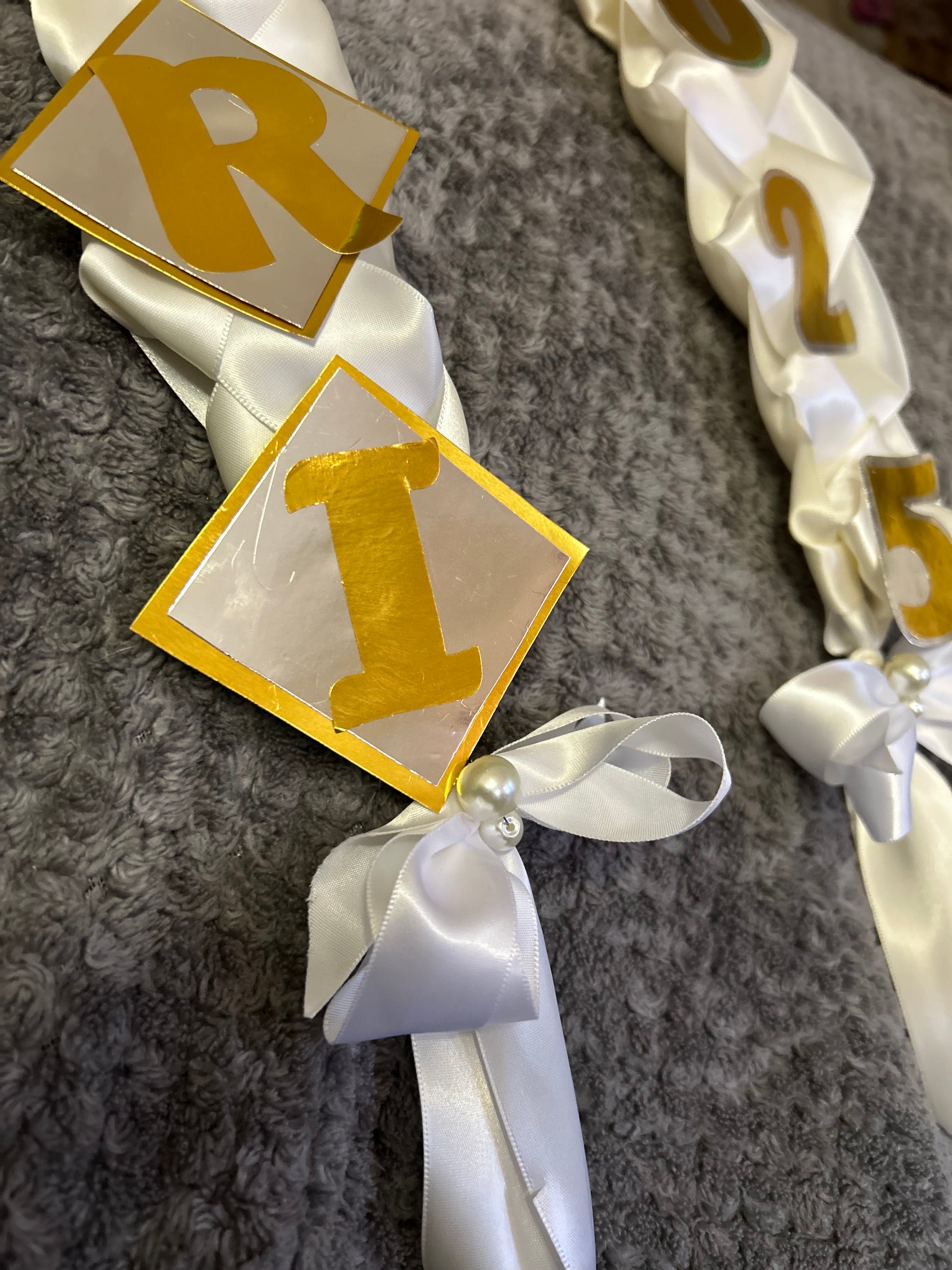Stunning ribbon leis in your colour of choice make a wonderful gift. Handmade with premium satin ribbons and fully customisable, this is the perfect present for a hardworking graduate. Can be made with or without money. Letters and numbers (graduation year) available for an additional fee. Please specify your desired (2) colours at checkout.