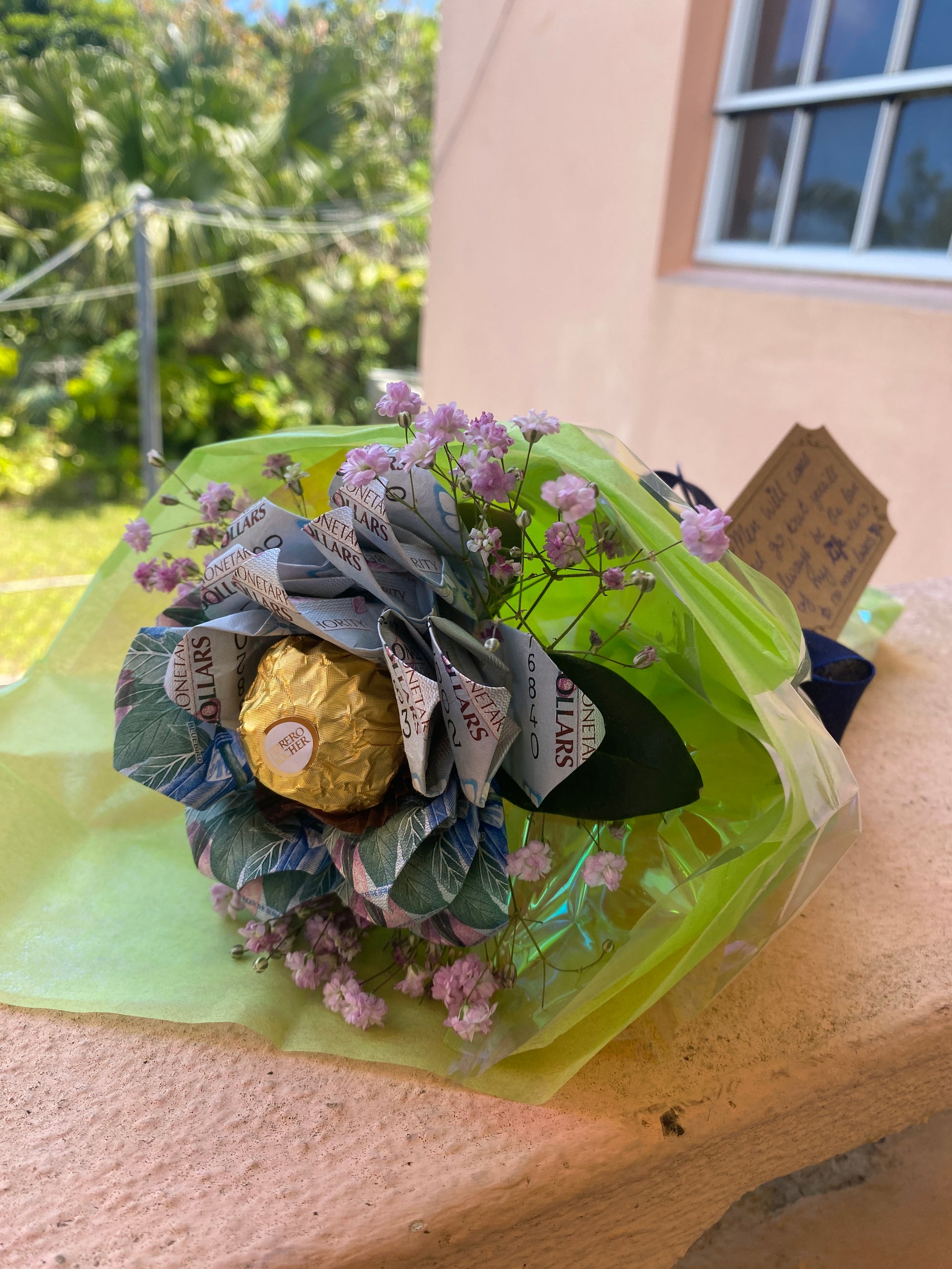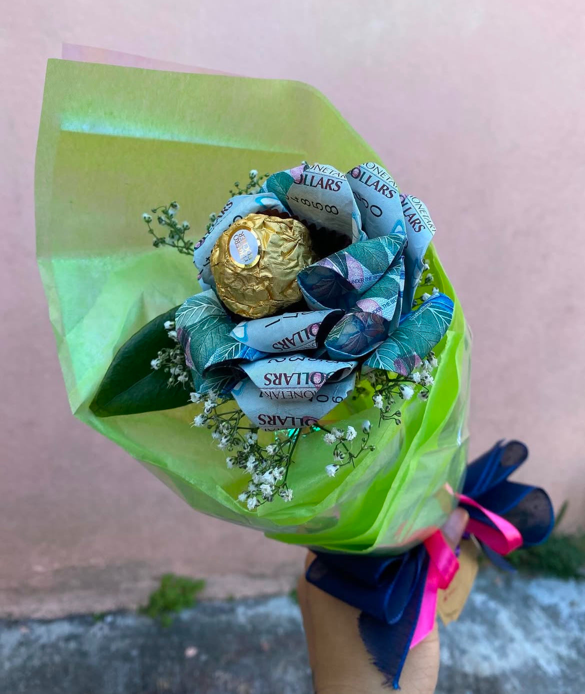 Sometimes a single flower says it all. Good for all occasions, this design is simple yet sweet. Featuring a handcrafted money rose with premium chocolate, framed with delicate greenery and gift wrapped with a bow.