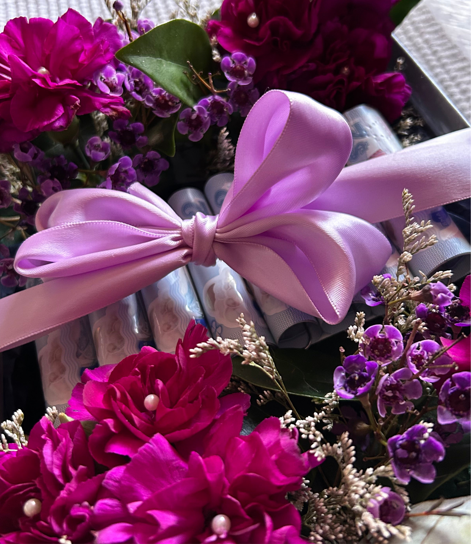 A box lovingly filled with money and fresh flowers, tied with a satin ribbon, ready to gift.